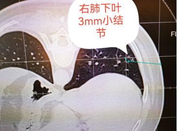 患者女性,体检发现右肺下叶外侧段直径约3mm小结节,患者及家属强烈要求手术切除,为达到最精准的切除同时最大程度的保留肺功能,应胸外科孙振主任团队要求,鞍钢总医院肿瘤医院周闯团队于CT引导下成功植入术前小结节定位矛。