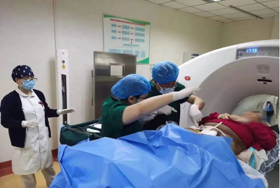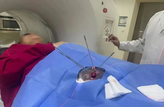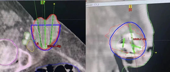 因本例患者年龄偏大,2月前已行外放射治疗后,给治疗增加难度,如继续行外放射治疗,正常组织损伤较大。吴登斌院长团队在微创治疗方面具有丰富的临床经验,经充分评估后,认为该患者符合近距离插植手术治疗指征。手术由吴院长亲自进行,在3D打印模板及CT引导下顺利完成。