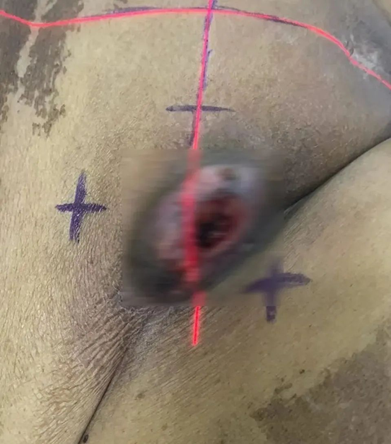 患者83岁老年女性,2021年10月初确诊为外阴鳞癌,行手术切除治疗并行4周期白蛋白紫杉醇联合卡铂方案化疗。今年3月,患者因腹股沟区疼痛,行CT检查提示“双肺多发转移瘤,会阴部肿瘤较前增大,腹腔、腹膜后、右髂血管旁淋巴结、双侧腹股沟淋巴结转移”,3月17日至4月22日于外院行盆腔放射治疗(DT45Gy/25F)、右腹股沟淋巴结及外阴病变放射治疗(DT50Gy/25F)。1周前患者再次出现腹股沟区疼痛,经过完善相关检查及详细查体后,胡大姨被诊断为外阴癌腹股沟淋巴结转移外照射治疗后复发。