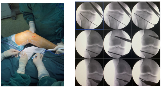 经过关节外科团队严谨的术前准备后,于术中确认合适的截骨平面,C型臂下透视测量下肢外观恢复变直,确保受力均匀,安放接骨板,反复确认力线......经过2个多小时的努力,顺利完成手术。