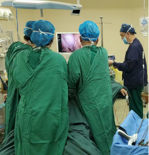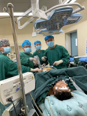 在充分完善术前检查及化验,请相关科室会诊,充分评估患者后,王明辉主任及田学昌副主任带领科室医师对患者病情进行讨论,为其制定手术方案,在入院后的第三天开始为患者实施减重手术(即腹腔镜下袖状胃切除术),在麻醉科杜永忠主任,肝胆外科王明辉主任、田学昌副主任、主管医生李睿明医师及手术室护士精密准确的配合下,仅用2个小时40分钟就完成了手术。