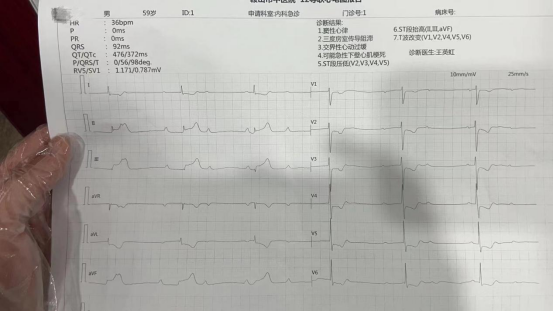 4月19日下午14时,张先生于家中突然出现剧烈胸痛,伴有恶心呕吐及头晕症状,并出现一过性意识恍惚,家属意识到患者病情严重,在家中自测血压仅为80/50mmHg,血压计显示脉搏仅为40次/分,家属于14:53拨打120呼救,急救中心依照就近原则以最快速度派出鞍山市中医院急救车组出诊,至患者家中行心电图检查提示急性ST段抬高型下壁正后壁右室心肌梗死,伴有III度房室传导阻滞。