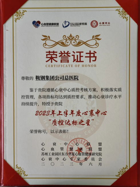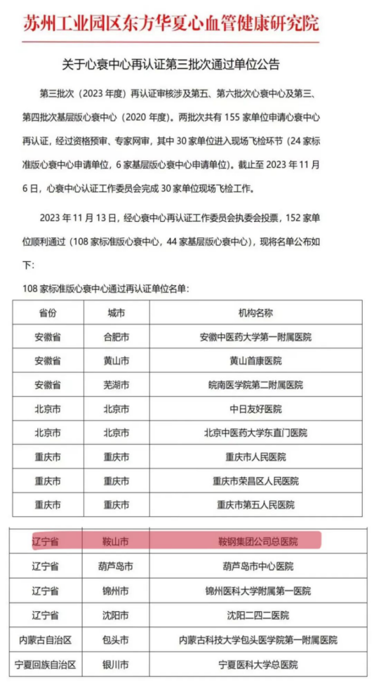近日,中国心血管健康联盟、中国心衰中心联盟、中国心衰中心认证工作委员会公布2023年第三批次心衰中心再认证通过单位公告,鞍钢总医院以高分一次性通过国家标准版心衰中心再认证。