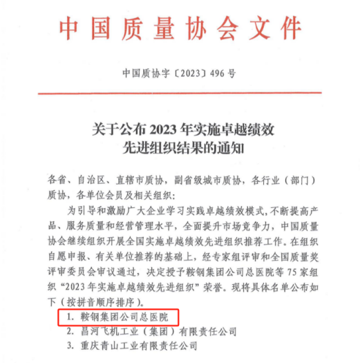 为全面贯彻党的二十大精神,落实党中央、国务院关于《质量强国建设纲要》的部署要求,深入推动新时代质量效益提升行动,激励和引导我国各类组织追求卓越经营,提高经济社会发展质量,中国质量协会于2023年12月1日在北京召开2023中国质量协会年会暨第二届全球追求卓越大会。通用技术环球医疗旗下鞍钢集团公司总医院在数千家参评单位中脱颖而出,荣获“2023年实施卓越绩效先进组织”称号,是全国75家获此殊荣的单位之一。鞍钢集团公司总医院医疗院长马冬梅代表医院到现场领奖。