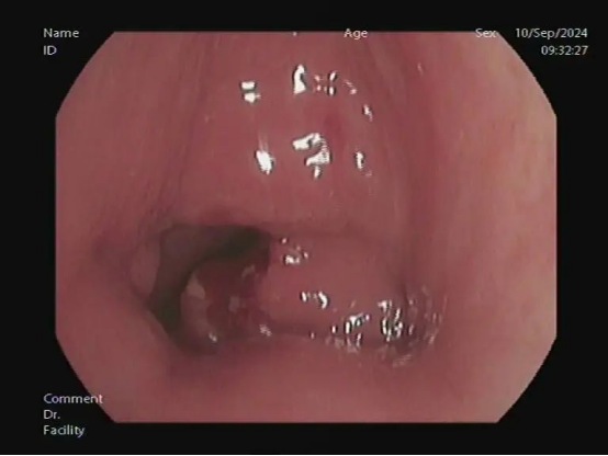 近日,一位67岁的许叔叔因咳嗽、气短1个月就诊我院,入院前1月曾于国内知名医院因甲状腺乳头状癌侵及气管行甲状腺癌半切+局部气管切除术。术后患者逐渐感声音嘶哑,伴有呼吸困难,家属为求进一步诊治就诊我院。入院后沈明主任查看肺CT提示患者主气道内管腔狭窄,不除外吻合口处肉芽组织增生致患者呼吸困难,并择期行支气管镜下检查,术中可见新生物阻塞管腔,并取新生物活检,病理提示炎性增生。