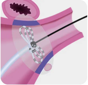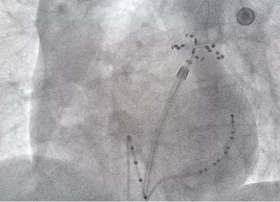 经过术前充分的筹备,手术团队、麻醉科和导管室医护人员的通力合作,心内科由张家立主任和刘晓明医生参与配合,手术有条不紊地进行。术中把脉冲消融导管放置于肺静脉口部和前庭部位,导管于不同位置可塑成不同的形状,通过脉冲消融系统释放2.0 kV的脉冲电场能量至心肌组织,致使心肌细胞达到有效的、不可逆的损伤,消灭了病变的组织。