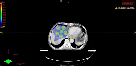 本次治疗的患者是一位结肠癌术后、靶向及化疗后出现肝转移的病人。针对其病情,选择了每次600cGy,总共五次的SFRT治疗方案,并同步应用了免疫疗法(PD-1抑制剂)。这种联合疗法不仅能精准打击肿瘤细胞,同时激活患者的免疫系统,进一步抑制肿瘤扩散。