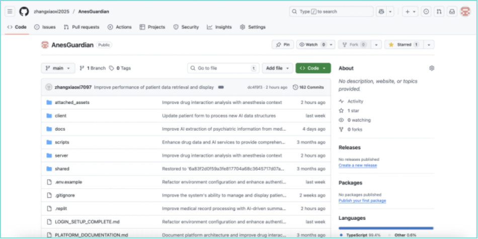 该系统深度融合临床经验与前沿人工智能技术,构建了一整套智能决策支持体系,重点实现三大核心突破:高效评估:将术前评估时间从30–60分钟大幅缩短至2–5分钟;精准决策:智能解析患者病历,融合权威评分系统,实现手术风险精准评估;用药安全:凭借独创的药物交互算法,实时智能预警潜在用药风险。为促进技术共享与学科交流,项目团队已将全部代码在全球最大开源平台GitHub上公开,展现出我院在智慧医疗领域的开放态度与技术自信。