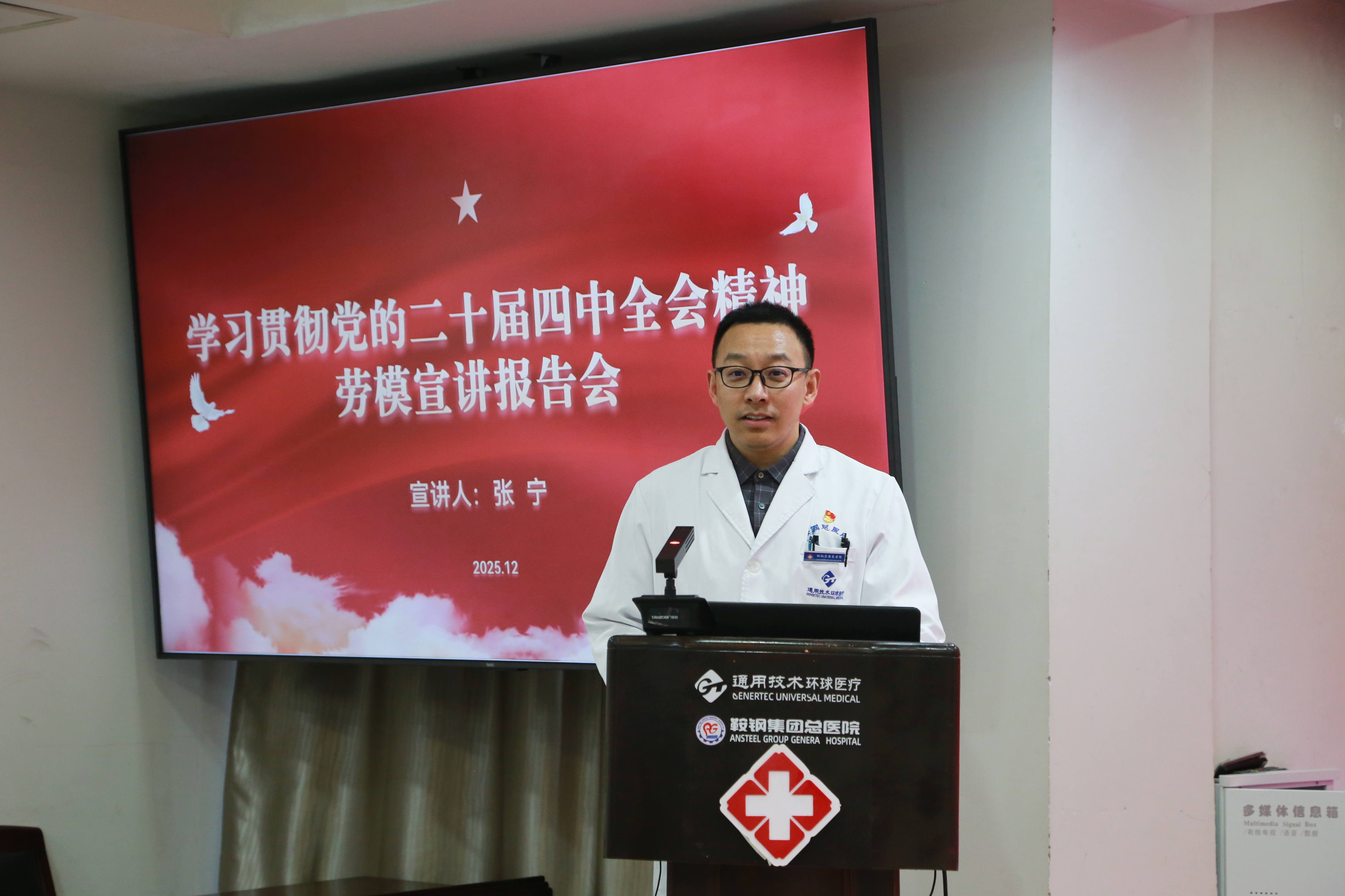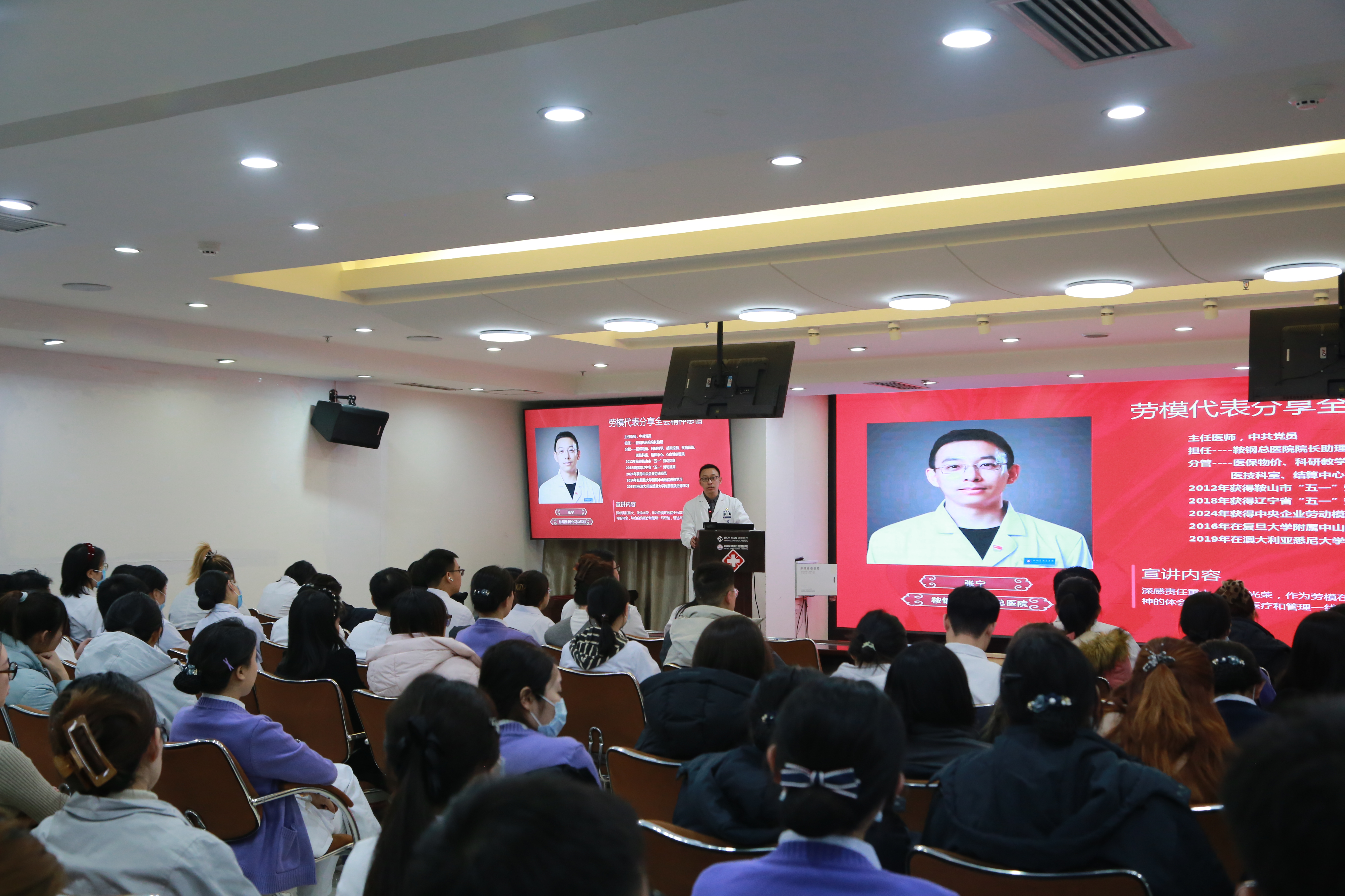 为深入学习宣传贯彻党的二十届四中全会精神,大力弘扬劳模精神、劳动精神、工匠精神,12月30日下午,鞍钢集团公司总医院在五号楼四楼多功能厅举办学习贯彻党的二十届四中全会精神劳模宣讲报告会。本次报告会由院党委宣传部部长王小松主持,特邀中央企业劳模、院长助理、心内三科主任张宁同志作专题宣讲。各基层党支部、团支部代表及2025年新入职员工共百余人参加学习。
