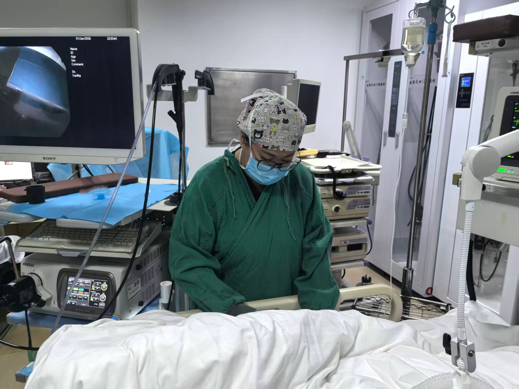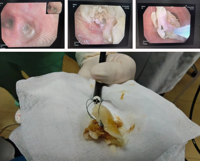 患者生命体征持续恶化,时间异常紧迫。呼吸介入团队到位后迅速评估,决定立即行支气管镜下气道异物取出术。这是对技术和心理的双重考验:异物位置位于右主支气管,患者血氧极低,操作必须又快又准。支气管镜室内,团队紧密配合。沈明主任沉着操作支气管镜,其他团队成员精准配合,麻醉医师全力维持患者生命体征。