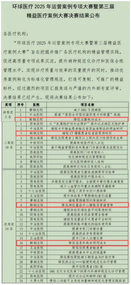 近日,通用技术环球医疗2025 年运营案例专项大赛暨第三届精益医疗案例大赛决赛圆满落幕,我院深耕精益管理,凭借 “全员、全过程、全方位” 的协同精益实践积淀与亮眼创新成效,在众多参赛单位中脱颖而出,斩获多项重磅荣誉 ——《降低后勤耗材成本》项目强势摘得特等奖,这也是我院连续两年荣膺该赛事最高荣誉;《缩短 CT 增强患者检查前等待时间》获评二等奖,《降低信息科耗材领用成本》《降低神经重症中心静脉导管堵管率》双双荣获优秀奖,精益实践成果获行业高度认可!